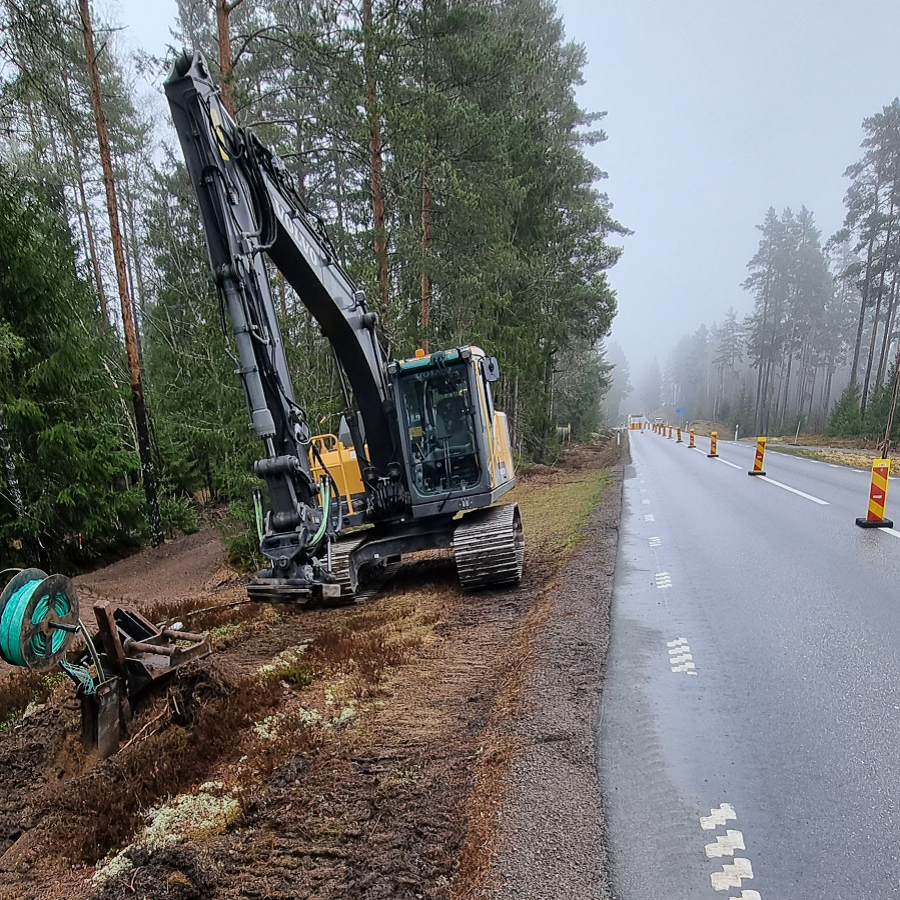 Stamnätsbyggnation är påbörjad från befintligt nät i Öfalla. Idag gick vi ut på väg 243 (Noravägen) och har under veckan förlagt och återställt sträckan fram till korsningen mot Karlsdal/Rockesholm. För närvarande pågår arbete efter väg 725 upp till Karlsdal, detta beräknas pågå i cirka tio arbetsdagar. De första veckorna har vi byggt cirka två av de totalt elva kilometer som ska byggas.