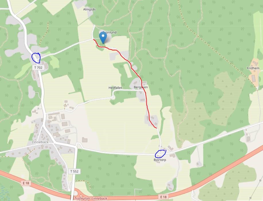 Med start vecka 20 stänger vi av vägen på olika ställen mellan Linnebäck 310 och Linnebäck 460 (röd linje i kartan nedan). Arbetet börjar från söder, Linnebäck 310, och vi jobbar oss norrut mot Linnebäck 460.