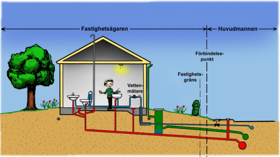 +Förbindelsepunkten är vanligtvis belägen 0,5 meter utanför fastighetsgränsen och den utgör gränsen mellan fastighetsägarens och VA-bolagets ansvarsområden. Det innebär att du som fastighetsägare äger och ansvarar för hela VA-installationen innanför förbindelsepunkten. Likaså ansvarar du för att allt installationsarbete, även sådant som inte kräver bygglov eller bygganmälan, utförs så att det uppfyller kraven enligt Boverkets regler och följer Miljöbalkens hänsynsregler. Alla installationer ska ses över och skötas regelbundet och du ska även se till att ledningarnas läge inom fastigheten finns dokumenterade. Vattenmätaren är den enda del av VA-installationen som tillhör VA-bolaget, men fastighetsägaren måste skydda den från frost och skador.